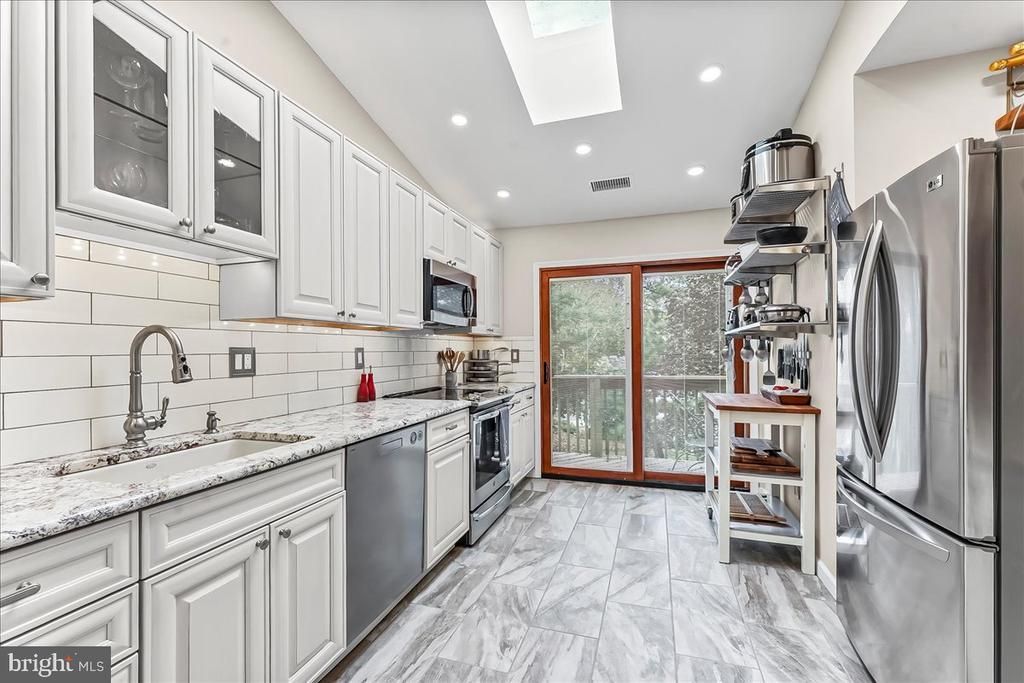 Experience the charm and convenience of Runnymeade Farms, nestled within the acclaimed Rose Tree Media School District. This exceptional 2-bedroom, 2-bath end unit is private, bright, and ready for you to move in. It features the largest floor plan in the community and includes a deeded owner's carport, two common area parking spots, and ample visitor parking. The HOA oversees the maintenance of common areas, including the community pool and tennis courts, as well as snow and trash removal. Step into a welcoming foyer with new porcelain tile flooring offers a spacious hall coat closet and a service closet housing a Bradford White hot water heater (installed in 2021 with a 10-year warranty) and the HVAC system (installed in 2022 with a 10-year warranty). The completely remodeled kitchen boasts a vaulted ceiling with skylight, dimmable recessed lighting, and granite countertops with quality white cabinetry. Additional features include under-cabinet lighting, soft-close doors and drawers, a Kohler cast iron sink with a professional-grade faucet, subway tile backsplash, and high-end stainless-steel appliances. The kitchen opens to a wrap-around deck through a sliding door with encased blinds. Enjoy a spacious living area with a vaulted ceiling and a wood-burning fireplace. Two 6-foot sliding doors lead to the wrap-around deck, and a staircase provides access to an internal courtyard. Adjacent to the living room, the large dining area features a vaulted ceiling with dimmable lighting and a chandelier. The primary bedroom is generously sized for a king bed and filled with natural light from a large triple-section window. It features dimmable recessed lighting and wall-mounted reading lamps. The newly remodeled ensuite bathroom includes a dual-sink vanity with deep drawers, two recessed medicine cabinets, and a large walk-in closet. A separate room with a pocket door leads to a tiled shower and toilet area. The second bedroom and full bath complete this home. The recently remodeled hall bath includes a new 48-inch vanity with a granite countertop, a recessed mirror medicine cabinet, porcelain tile flooring with underfloor heating. The washer and dryer are conveniently located in a closet within the bathroom. Abundant low-voltage dimmable recessed lighting has been installed throughout the home. All appliances are included, as well as electrical fixtures, blinds, drapery, televisions with wall brackets, shelving, and an existing security system. The fireplace and chimney have been professionally cleaned and inspected.