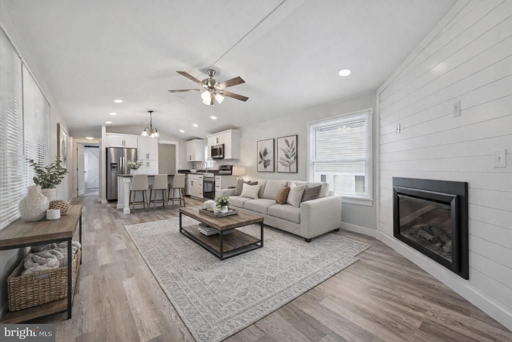 Welcome to this beautifully renovated 2-bedroom, 2-bath mobile home-style ranch, thoughtfully updated with a bright, open-concept layout designed for modern living. The inviting main living space features an electric fireplace with ship lap feature wall that adds warmth and style, flowing seamlessly into the updated kitchen with crisp white cabinetry, stunning countertops, large island and stainless-steel appliances—perfect for everyday living and entertaining alike. The primary suite offers a private retreat with an ensuite bath highlighted by a sliding barn door, wainscoting and a dual-sink vanity. A second sunny bedroom features a charming bay window and easy access to the full hall bath. With fresh finishes throughout and a light, welcoming feel, this move-in-ready home blends comfort, style, and functionality in one beautifully refreshed package. Other updated features include a newer roof, windows, heater, water heater, skirting, electrical, plumbing, 10x24 deck, paver patio, all new flooring throughout, and custom moldings. Cabinetry features crown molding, soft close drawers, and pull out drawers. Owner paid close attention to every detail in this home! Lot rent includes Water, sewer, trash, snow removal, and community pool. Cash or mobile home financing required. A list of lenders is available upon request.