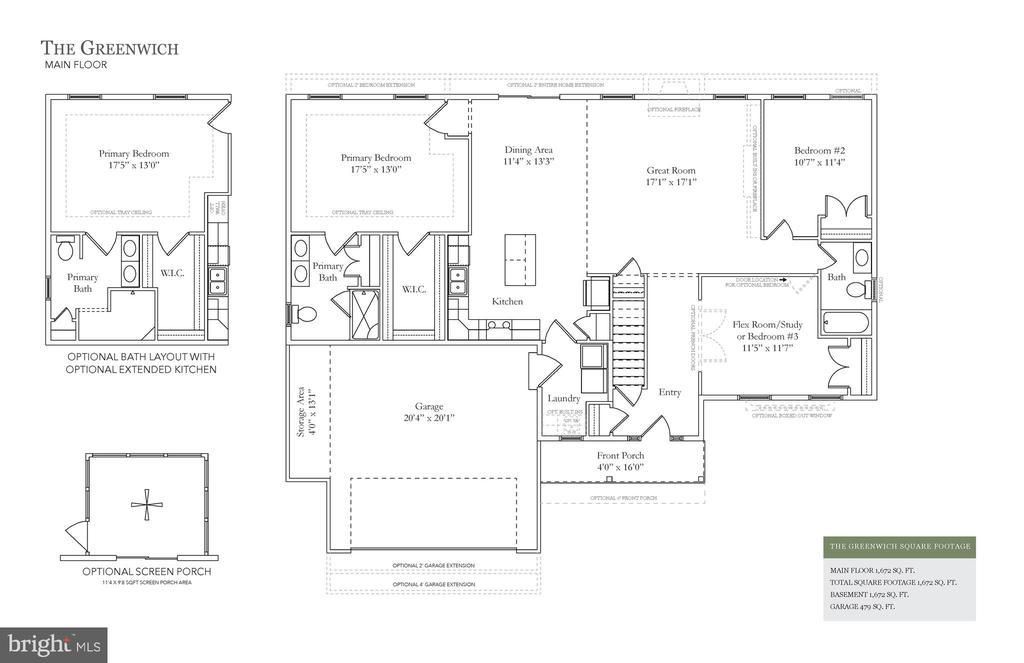 This Greenwich floorplan is available to be built at the Meadows at Wicklow. Visit our model homes during our weekly Open House; Wednesday through Saturday from 12-5pm. The Meadows at Wicklow 55+ Community offers 5 floorplans to build. At 1,672 sq ft of living space, the Greenwich is our mid-sized ranch home. Featuring two to three bedrooms and two baths, this charming home has the potential to accommodate more living space with additional storage in your garage, added space towards the rear of your home and by adding a screened porch. The Greenwich allows for open concept living while providing privacy for your owner’s bedroom suite with guest bedrooms located adjacent to the great room. With charming built-ins, fireplace, and screened porch additions, it’s not hard to imagine this house transforming into your warm and cozy home. Many upgrades are included in the base price such as 9ft ceilings on first floor, full unfinished basement, maple cabinetry, stainless steel appliances and much more! Must use builder's affiliated lender and title company for any builder incentive. Terms and Conditions apply. See agent for details.